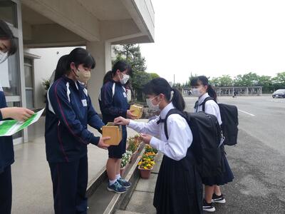 朝7:50から昇降口前で、緑の募金活動を行っています。