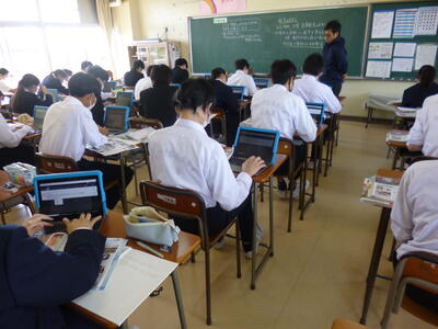 タブレットを活用し、調べた内容をまとめている場面です。