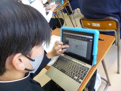 タブレットに、「本時の振り返り」を入力しています。